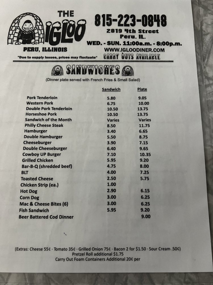 Welcome to Igloo Drive-In, a cherished landmark in Peru, IL, that has been delighting patrons for almost a century. This family-owned gem specializes in sumptuous burgers and sandwiches, drawing in crowds with its hearty pork tenderloins and legendary home-cut fries. The inviting atmosphere boasts a charming old-school vibe, perfect for groups and families alike.